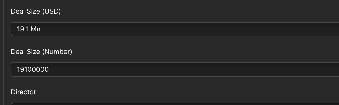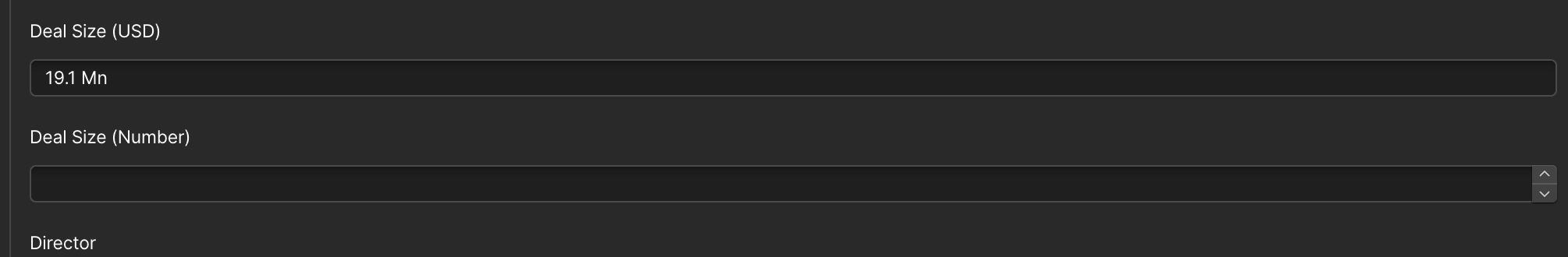 IndigoEdge is an investment bank with a deep portfolio. Their CMS had a "Deal Size" field written in plain text (e.g., "20 Mn"). To implement price range filters, I created a new CMS field: Deal Size (Number).